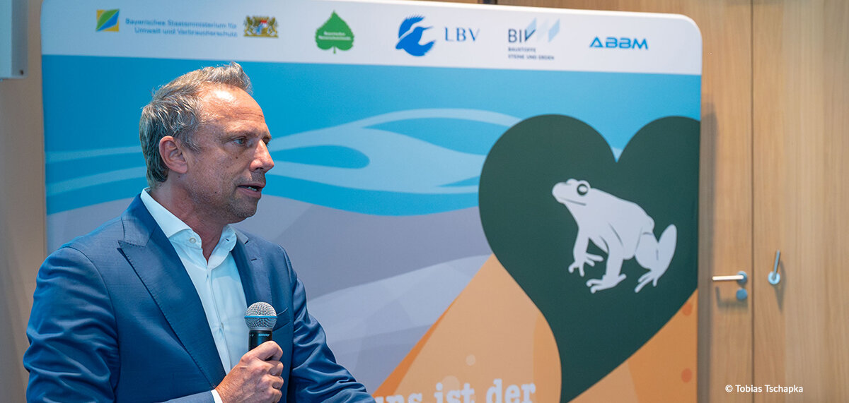 Das mit dem Umweltpreis der Bayerischen Landesstiftung ausgezeichnete Projekt „Natur auf Zeit“ zur Förderung und Erhaltung von Amphibienarten in Gruben und Steinbrüchen vereint wirtschaftliche und naturschutzfachliche Interessen und ist Vorbild für andere Industriezweige und Länder. Heute hat der Bayerische Umweltminister Thorsten Glauber die am Artenschutzprojekt „Natur auf Zeit“ beteiligten Rohstoffbetriebe für ihr herausragendes Engagement gewürdigt. Vor rund 100 Gästen sowie beteiligten Organisationen und Behörden übergab der Umweltminister zusammen mit dem Vorsitzenden des bayerischen Naturschutzverbands LBV (Landesbundes für Vogel- und Naturschutz), Dr. Norbert Schäffer, dem Präsidenten des Bayerischen Industrie-verbandes Baustoffe, Steine und Erden e.V. (BIV), Georg Fetzer, und den Projektverantwortlichen Dr. Stephanie Gillhuber vom BIV und dem LBV-Naturschutzfachbeauftragten Dr. Andreas von Lindeiner die Urkunden und dazugehörigen Projektschilder an die teilnehmenden Rohstoffstandorte.